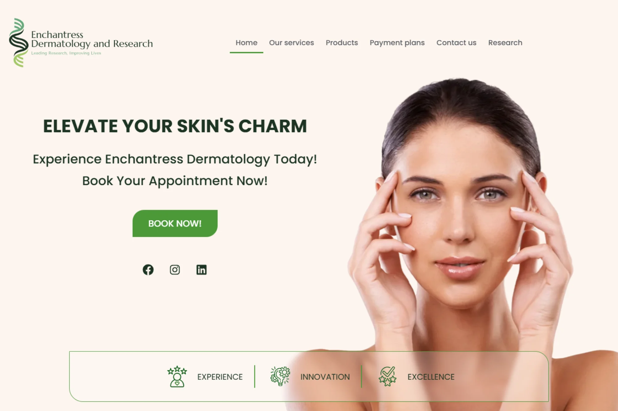 Criar um site elegante e profissional para a Enchantress Derma, uma clínica especializada em tratamentos estéticos avançados. O objetivo era refletir a exclusividade e a qualidade dos seus serviços, proporcionando uma experiência digital intuitiva e atrativa que permitisse aos clientes conhecer os tratamentos, agendar consultas e confiar na marca desde o primeiro contato.