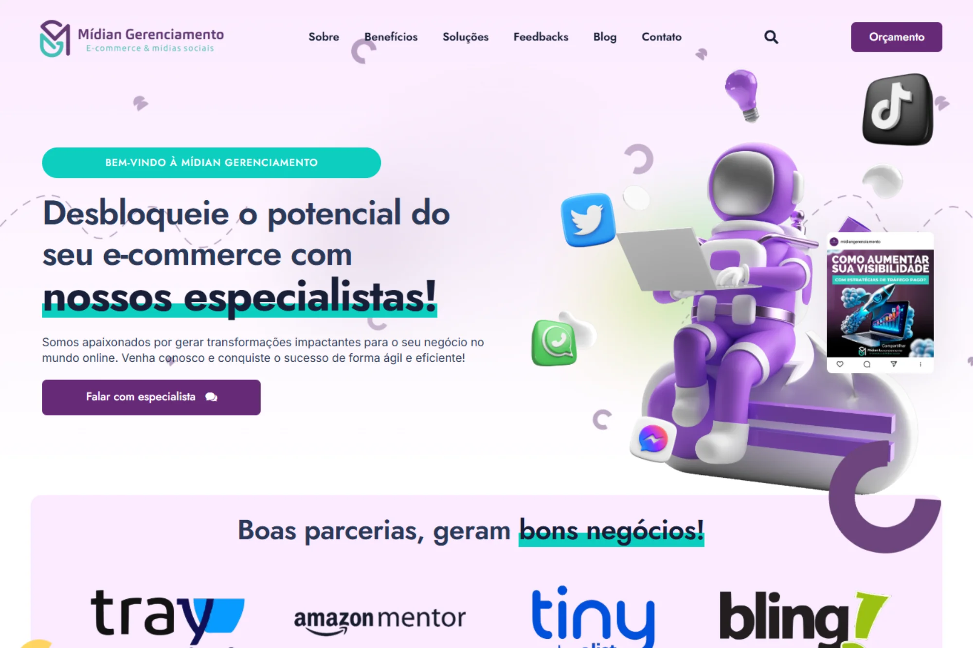 Desenvolver um site profissional e atraente para a Midian Gerenciamento, uma agência de marketing digital focada em potencializar a presença online de seus clientes. O objetivo era criar uma plataforma que refletisse sua expertise em estratégias digitais, destacando seus serviços, casos de sucesso e facilitando a aquisição de novos clientes.