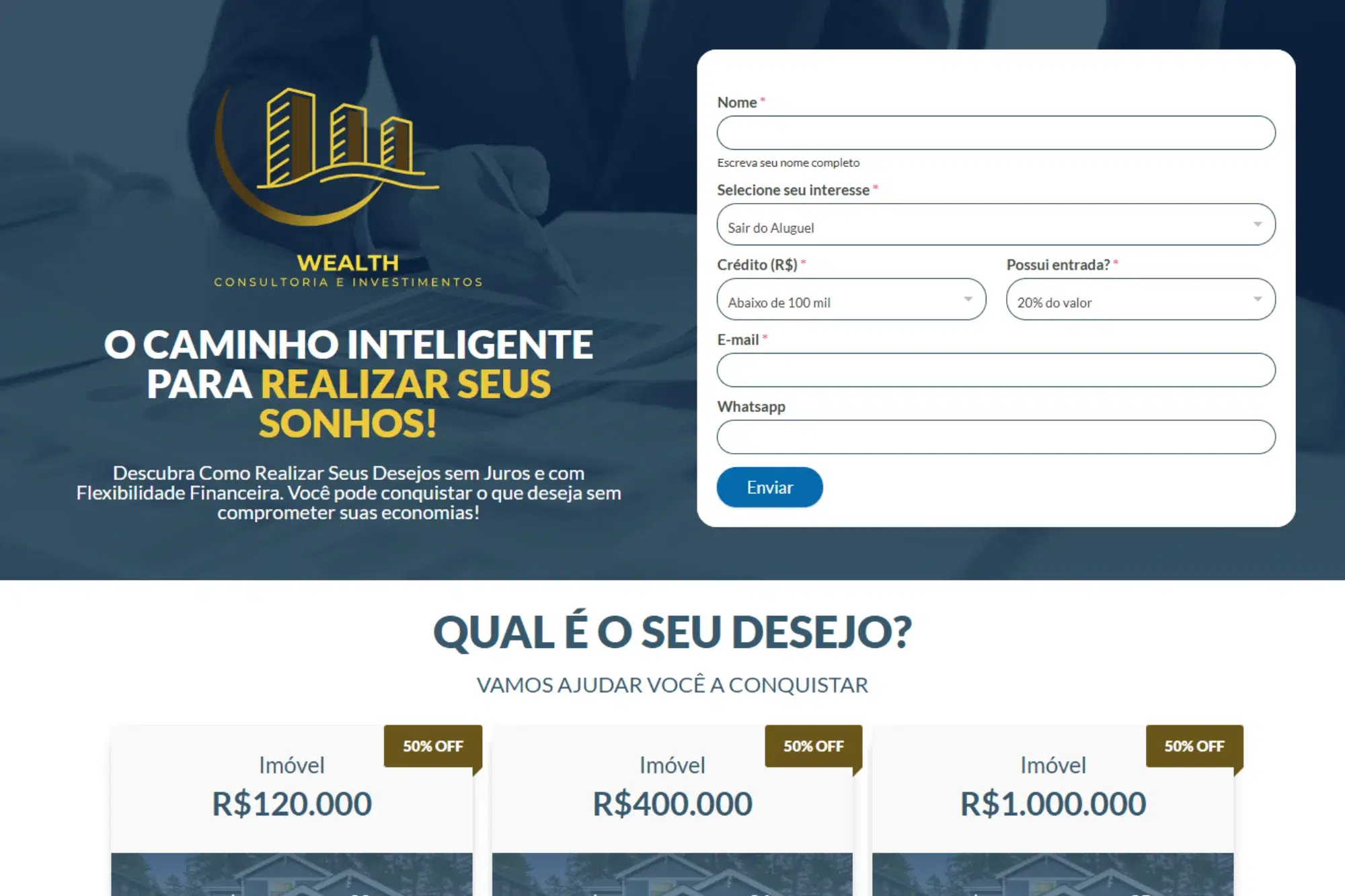 Desenvolver um site profissional e atraente para Wealth Consulting and Investments, focado em destacar suas soluções de financiamento e consórcio. O principal objetivo era transmitir confiança e clareza em seus serviços, facilitando a captação de leads por meio de formulários estrategicamente posicionados e chamadas para ação persuasivas.